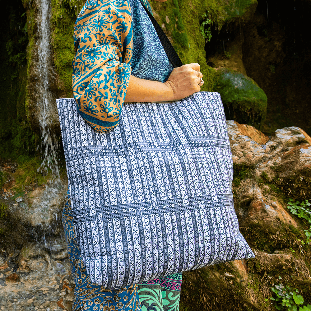Inspired by a door carving found in Durbar Square, our Blind Shadows bag is a visualization of an average day in the life of a typical human. One full of highs and lows and brights and darks that require careful threading of emotion, while remaining steadfast in our mindful empathy of the peaks and valleys perforating the days of the souls we encounter throughout our own.