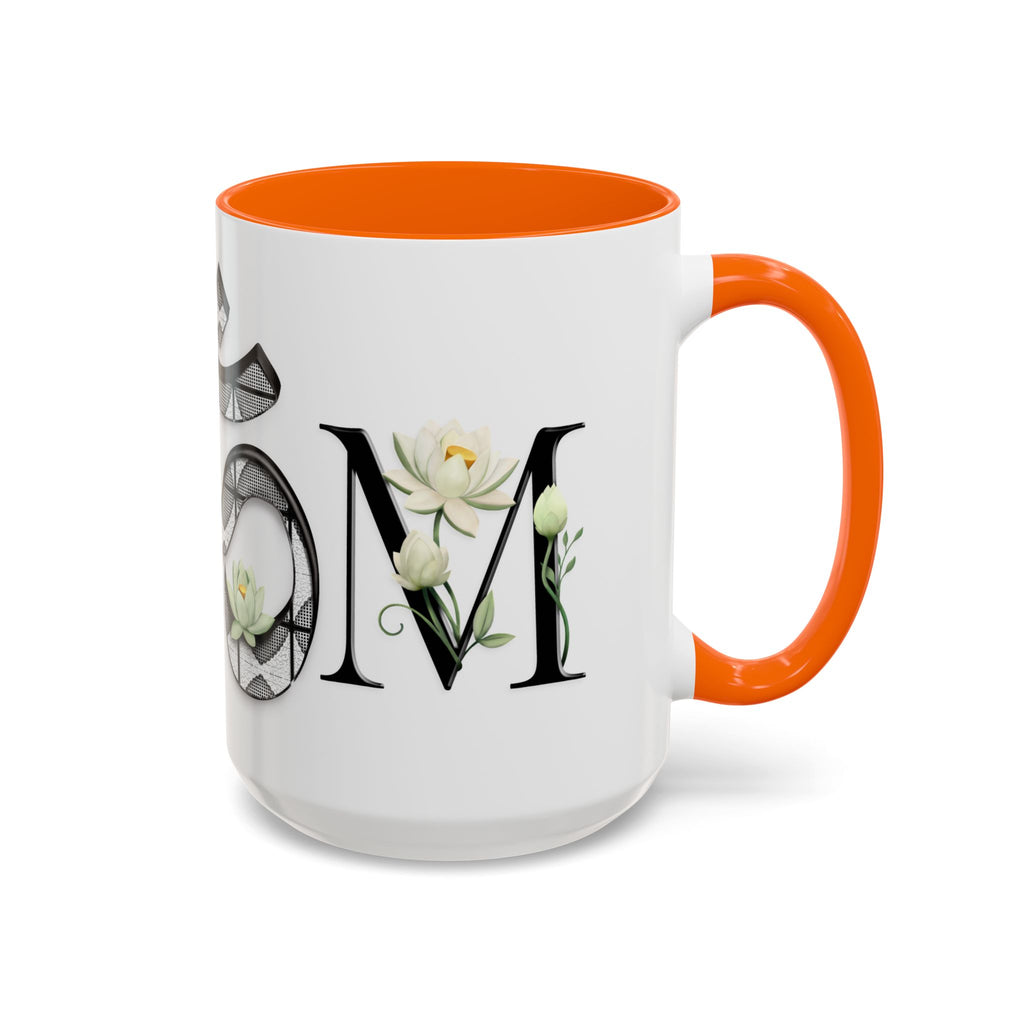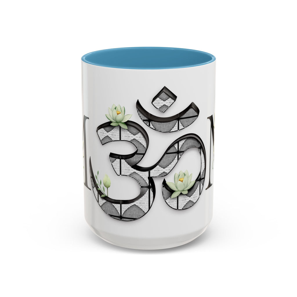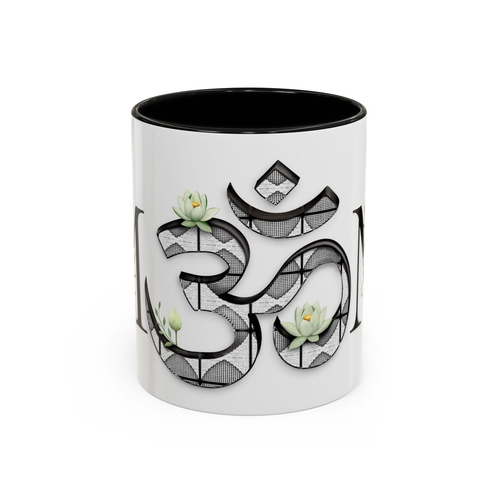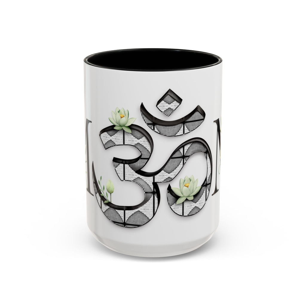 White Lotus M'Om Accent Mug – Om Symbol with Hand-Drawn Lotus Flowers and Custom Abstract Himalayan Pattern Designs