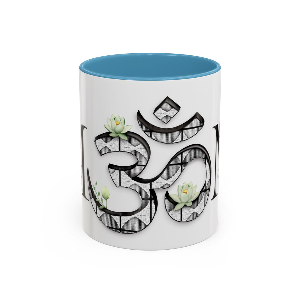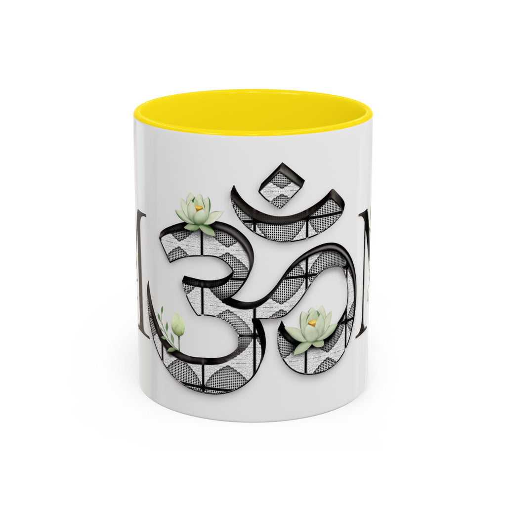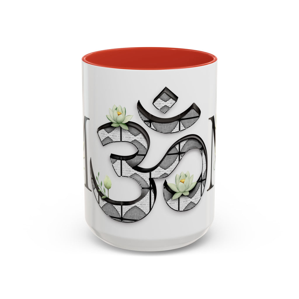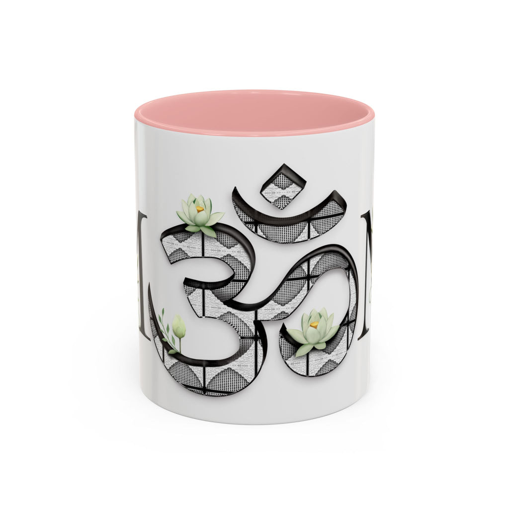 White Lotus M'Om Accent Mug – Om Symbol with Hand-Drawn Lotus Flowers and Custom Abstract Himalayan Pattern Designs