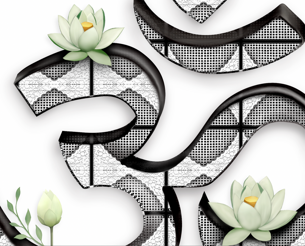 The classic Om symbol is adorned with a unique pattern drawn from our Windows photo series. The intricate design began as a photograph of carved wood from a centuries-old structure in the royal city of Patan, Nepal — reinterpreted through hand-drawn illustration and digital refinement into a graceful, modern abstraction.