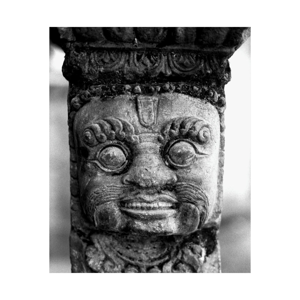 A looming face lives in a decorative column in Patan Nepal's Durbar Square.