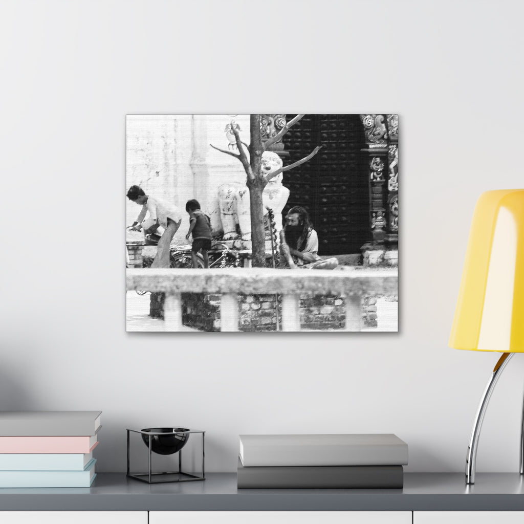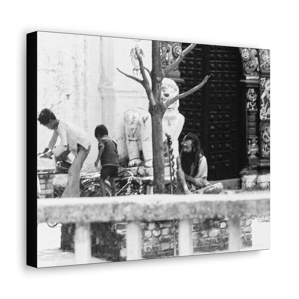 A local ascetic, commonly seen throughout Nepal, watches over local children playing.