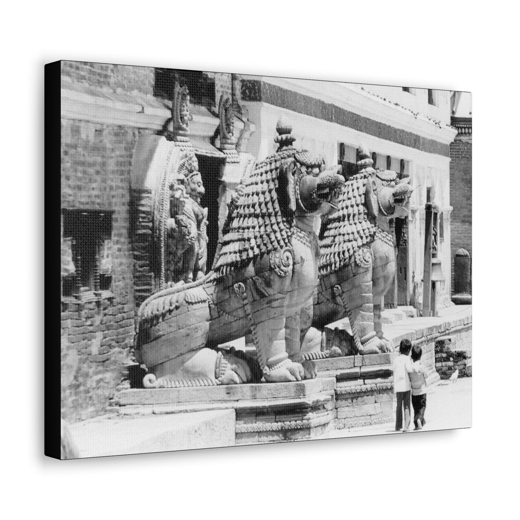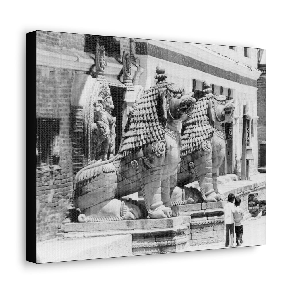 9 - Giant Stone Lion Statues Watching Over Kids -Patan Nepal, Durbar Square - Canvas Print